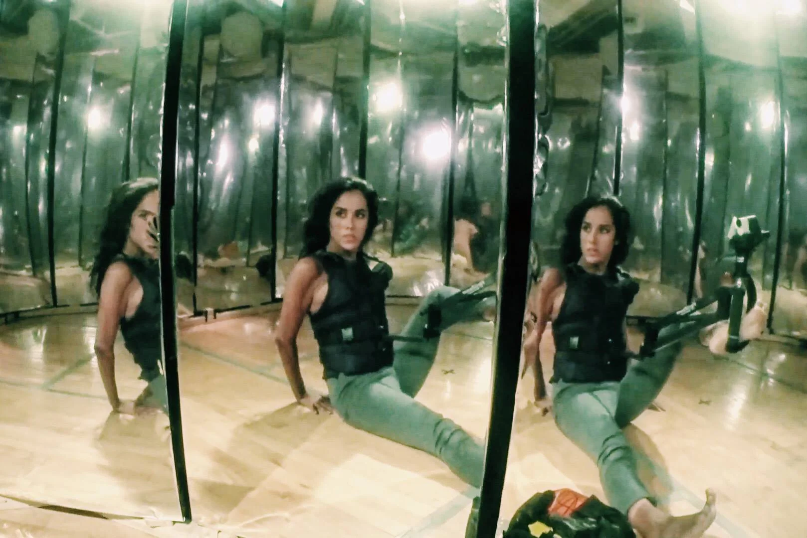 ”Your Heart & Your Belly & Your Whole Insides Felt Empty & Wanting & Hollow / Episode 2” is the second installment of a performance depicting a dance-for-two between woman and void. Episode 2 is both a live-feed video projection and a live performance. Audiences can experience the performance from outside the mirrored room by either watching it through the 1 inch gaps between the mirrors or through the live feed video projected on a wall outside the mirrored room. A camera strapped to the performer’s body, manipulated by her movements, generates the ultimate female gaze. The 360˚ room multiplies the her reflection as well as reveals her to be entirely alone. She confronts her multiplicity as an act of intimacy with herself.