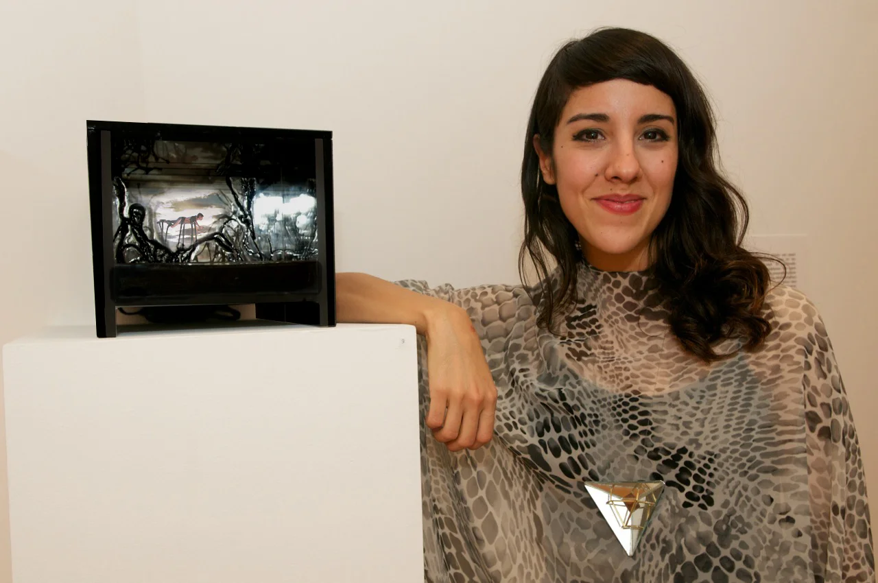 Laid In Earth is a tiny baroque opera in a 8x9.5x16" reflective acrylic box-maquette holding 3 inches of dyed water.